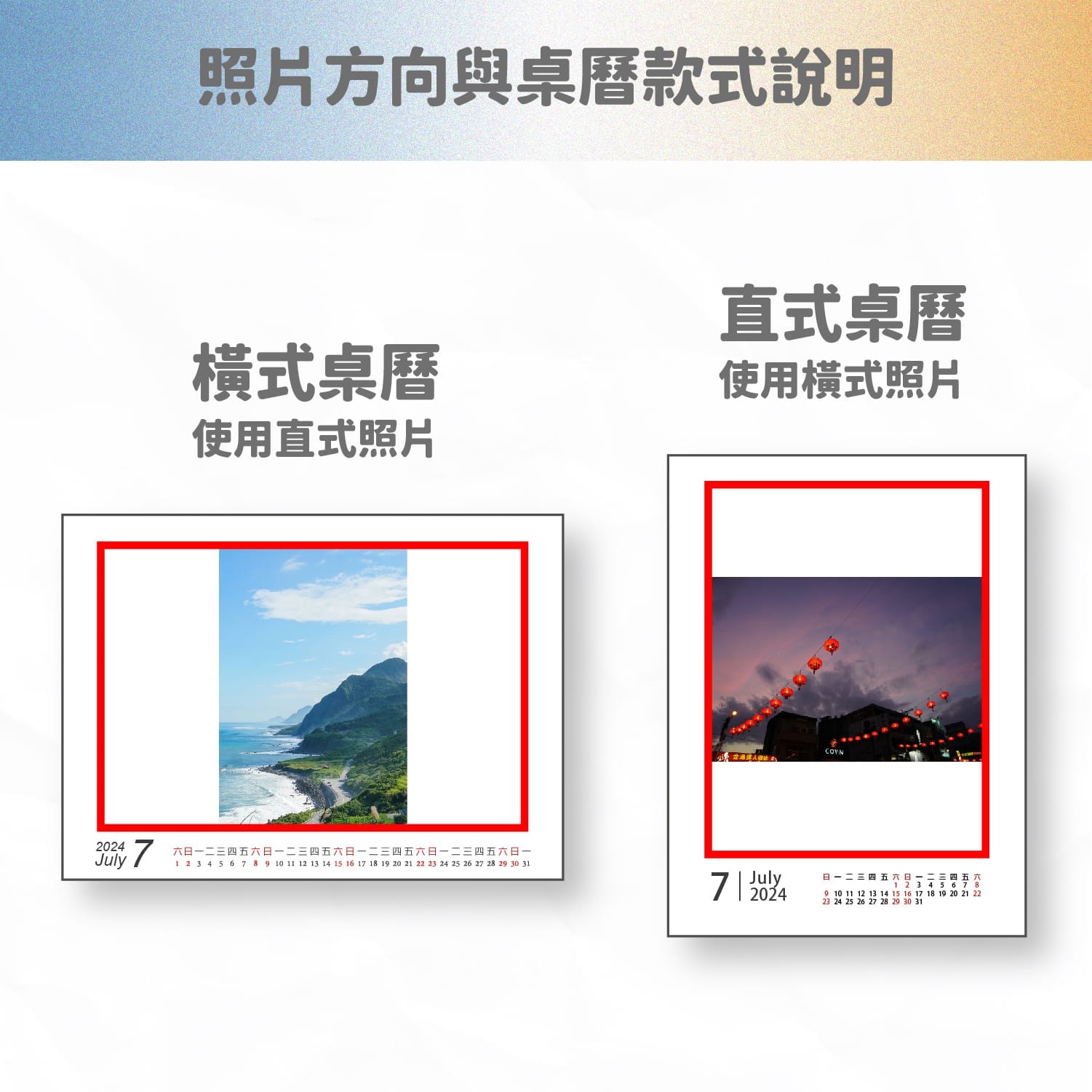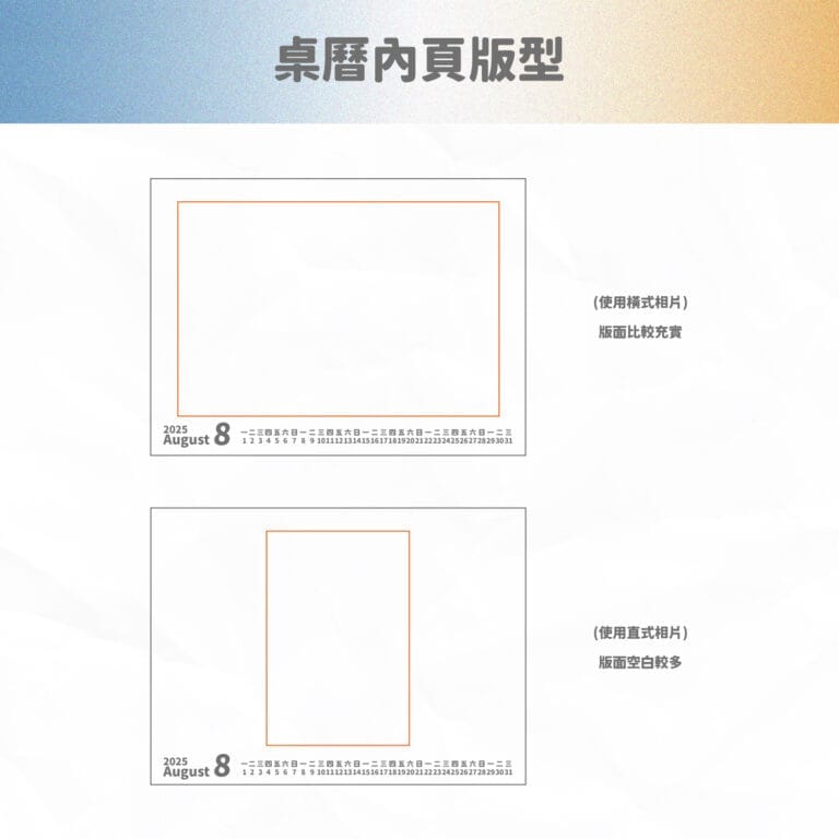 - 封面入字一律是在封面的「右下角相片外的白色空白處」,圖片中看到的左下角的「Calendar 2025」,不會移除